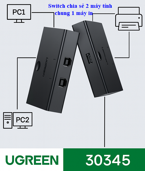 Giải pháp hoàn hảo chính là Switch chia sẻ Ugreen 30345 – thiết bị cho phép 2 máy tính chia sẻ cùng 1 máy in, ổ cứng, scanner hoặc USB qua cổng USB 2.0 tốc độ cao.